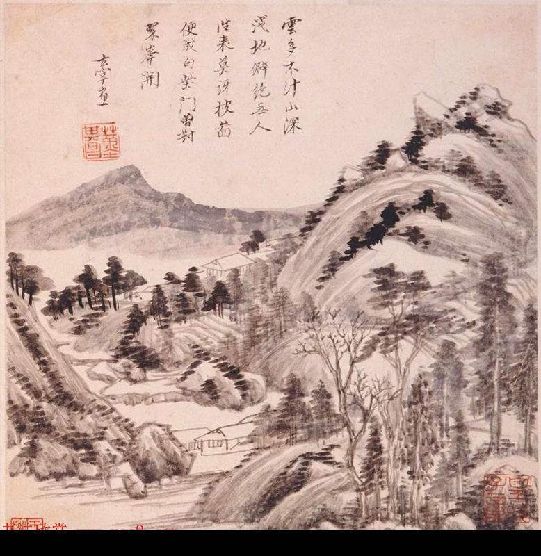 董其昌仿古山水图册,万历四十五年(1617),每开右幅有陈万